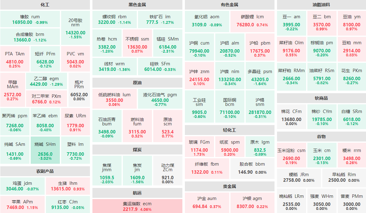 跌幅方面,烧碱主力跌落3.02%,报2636.0元/吨;锰硅主力跌落2.31%,报6184.00元/吨;焦煤主力跌落2.03%,报1059.5元/吨;20号胶、焦炭、线%。